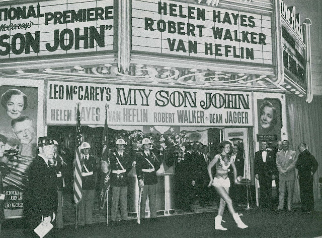 As hunters go in pursuit of some rare and exotic quarry, we drove two and a half hours last week so I could realize a near lifetime desire of seeing My Son John, which was shown in 35mm at the splendid North Carolina Museum Of Art. Some of you know Raleigh merely as that place where Barney Fife eventually went to work and was mistreated by Richard X. Slattery, but in actuality, it’s our state capital and has one of the best classic film series going thanks to The Movie Diva, whose efforts for the Museum have yielded many rare screenings, but none so remarkable as this wounded survivor out of Paramount vaults. The only print of My Son John they had, so I was told, and its oft-warped struggle projecting was the result of dreaded vinegar syndrome, that curse of safety film and celluloid’s equivalent of terminal cancer. My Son John has been buried alive for fifty-two years. It is the bastard offspring of many distinguished careers. Leo McCarey was pilloried for directing it. Helen Hayes regretted coming out of movie retirement to make it, and Robert Walker died before they could finish it. Misinformation was put out on My Son John months before release and a lot of that is still in circulation. I've not heard of the film being shown on television since ABC had a single Sunday Night At The Movies run around 1970. Syndication listings did not reflect My Son John in any US available package, though Paramount still owns the negative. TCM recently made a deal with the latter to broadcast a large group of features starting in a few months (I noticed Union Station coming up in January). Will My Son John finally resurface there? --- a phoenix rising out of ashes much like Paramount's neglected Ace In The Hole, also difficult to see until recently? I don’t expect DVD exposure. Would even Criterion embrace a feature so discredited? One that’s been described variously as hysterical, malignant, embarrassing, McCarthyite, idiotic, paranoid? Appropriate perhaps that the Museum’s print be tainted with vinegar, for My Son John remains a pariah best handled with sterilized gloves, as hot a social and political potato as it ever was.