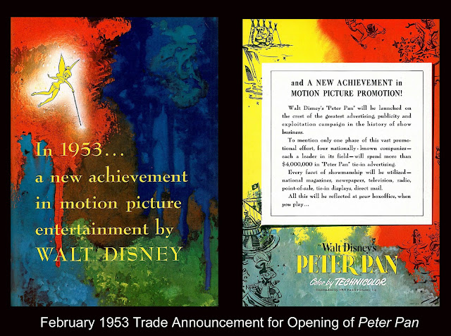 Disney films for me represent happy times during an age of innocence. DVD look-backs emphasize joy of attending first-runs where turnstiles hummed and everyone whistled a merry tune. What actually went on behind showman curtains was not so idyllic. A Cold War in news headlines was mirrored by one fought near as ferocious by the industry’s mutually suspicious distribution and exhibition arms. Sometimes their war flashed hot. It seemed a non-stop game of one side trying to do in the other. Government sanctions broke up the trust that enabled film companies to control theatres in addition to producing and delivering movies, but home office powers were since nibbling around edges of the law to get back advantage they enjoyed when business was wide open and unrestricted. Independent showmen as ever took the brunt of policies squeezing them out of money generated by features expected to do well. Peter Pan was such an attraction and came along at a fraying point between opponents spoiling for battle. Distribution’s latest scheme was to pre-release better product for advanced admissions. Never mind that consent decrees entered into by the majors forbade such price fixing. Contracts were slippery and complicated, but end result found theatres forced to bump ticket rates in order to get pictures their customers wanted most to see. The policy had been applied to Quo Vadis, Ivanhoe, The Greatest Show On Earth, and a number of others. Exhibitor groups pointed out that more titles had been sold this way in an eighteen-month period than in ten years going before. Pre-releasing was merely a device for keeping top attractions in larger houses for longer runs and depriving small theatres of opportunity to compete with subsequent playing at lower prices. Favored venues tended to be those affiliated with powerful chains. They had muscle to negotiate terms and guarantee a profit. Regular runs at pet locations would follow pre-release engagements often in those same spots, ignoring clearances independent theatres depended on to differentiate their playing time from pricier first-runs. By the time affiliated powerhouses were done, attractions were not so attractive, as national promotion and drum beating was timed to key dates. Small auditoriums wound up with shows gone stale for their public.