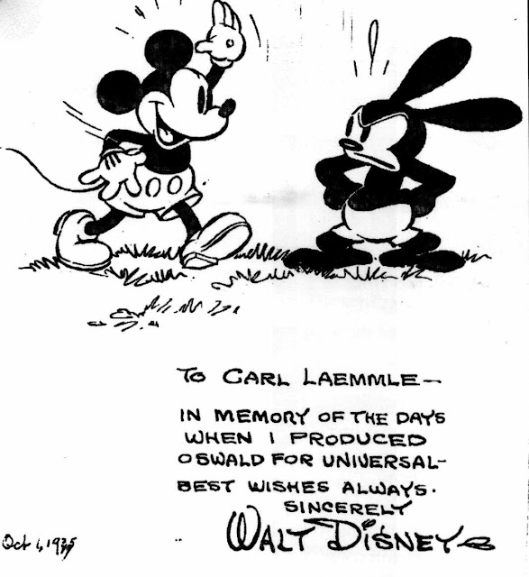 When Michael Barrier’s definitive Hollywood Cartoons was published in 1999, he reported nine surviving Disney Oswald cartoons. Following their acquisition of rights in 2006, the Disney Company instituted a worldwide archival search for missing shorts among the 27 Walt made. As of December 2007 and the release of Walt Disney Treasures - The Adventures of Oswald the Lucky Rabbit, thirteen were accounted for and included in the DVD. That’s pretty much half the group and a better survival rate than most silent cartoons can boast. Quality varies according to where and from whom prints were acquired. Some originated with collectors, others from European sources. A few survived thanks to Universal having reissued them with music tracks (albeit edited) during the early thirties. Disney has manufactured some toys and Oswald figures to generate awareness of the character. I guess it’s conceivable they’d use him in new animation. Perhaps a Bugs/Daffy inspired rivalry with Mickey, such as Walt’s card to Carl Laemmle anticipated? The search meanwhile continues for missing Oswald silents. It’s quite possible more will turn up. There may even be a Greenbriar reader with one or more tucked away.