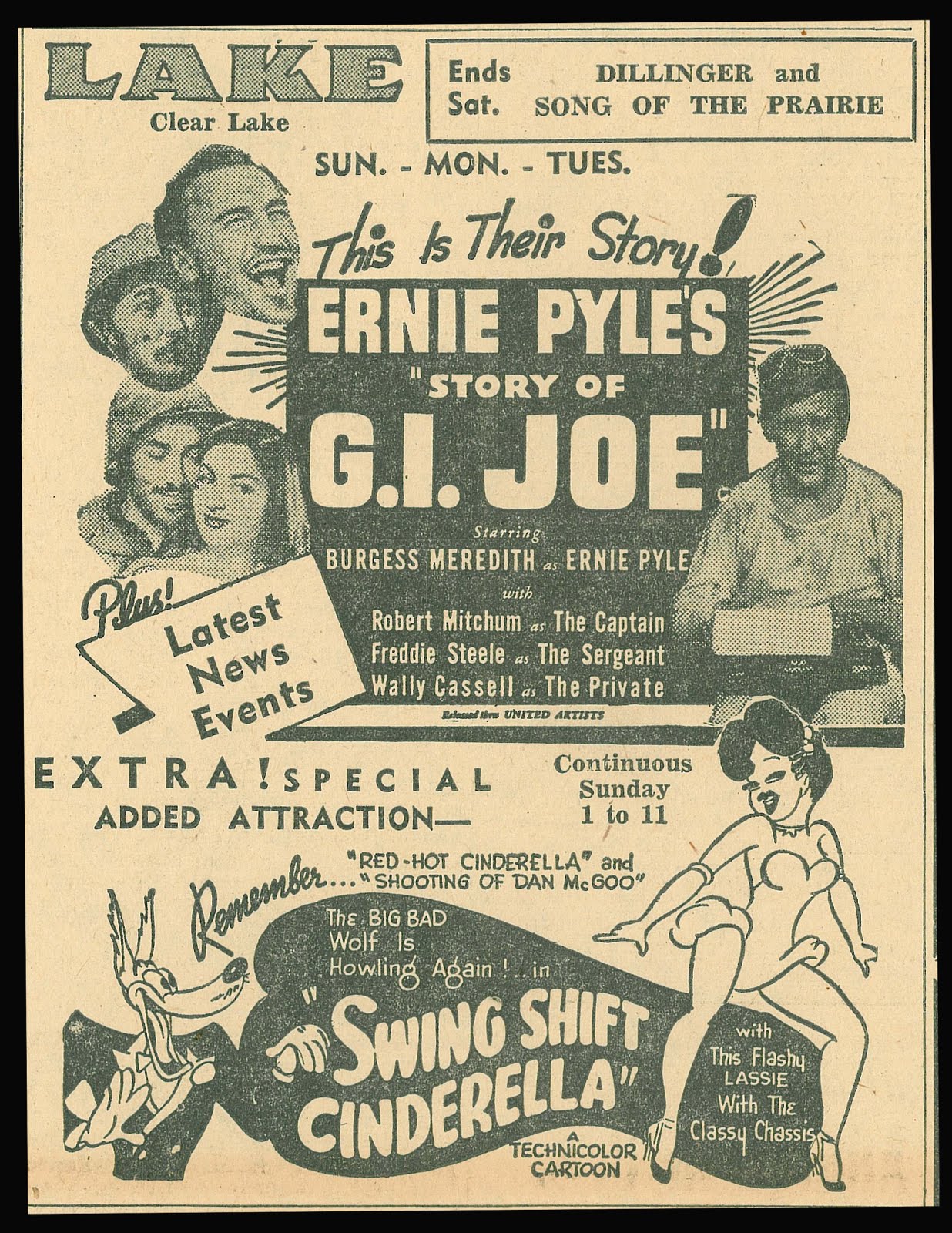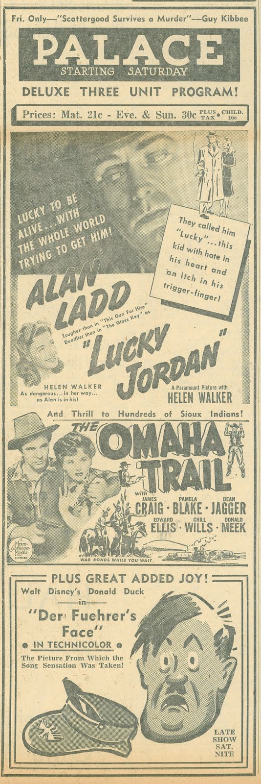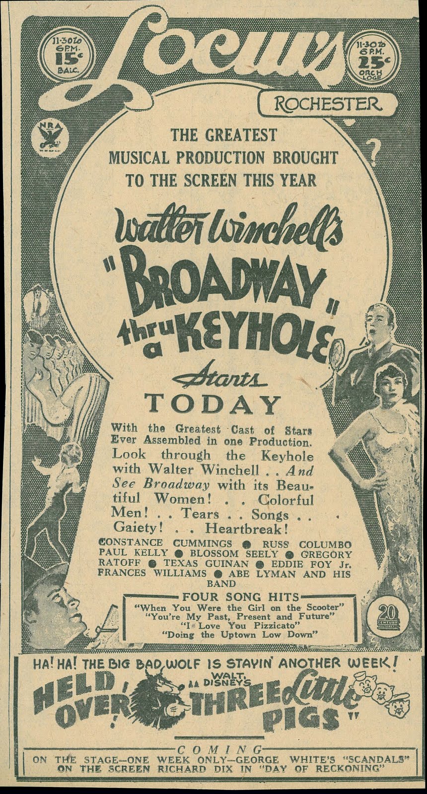 Ha! Ha! The Big Bad Wolf Is Stayin' Another Week! says the ad above for a 1933 run of The Three Little Pigs at Rochester's Loew's. I'd read this was cartooning's first social phenomenon. Extended runs, song sheets at every piano, its theme whistled on street corners throughout the land, etc. The ad at least reveals The Three Little Pigs' staying power at the Loew's, as evidenced by fact it's still there as Broadway Through A Keyhole takes over feature duties. Were patrons coming for second and third helpings of Disney's breakout reel? I'm trying to think of another hit tune that emerged from one of his shorts. Der Fuhrer's Face was one ... but lacked permanence of Who's Afraid Of The Big Bad Wolf?. Still, it was a wartime hit, and Spike Jones among others lent interpretation to considerable success. The Palace Theatre here calls Der Fuhrer's Face "Great Added Joy" and references its Song Sensation. Worth noting too is fact that Disney's cartoon is as prominently advertised as the two features in this Deluxe Three Unit Program.