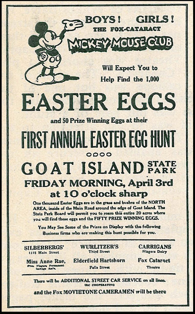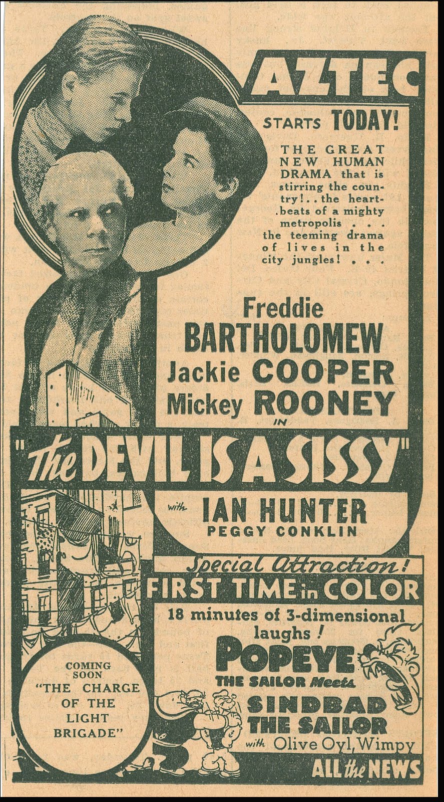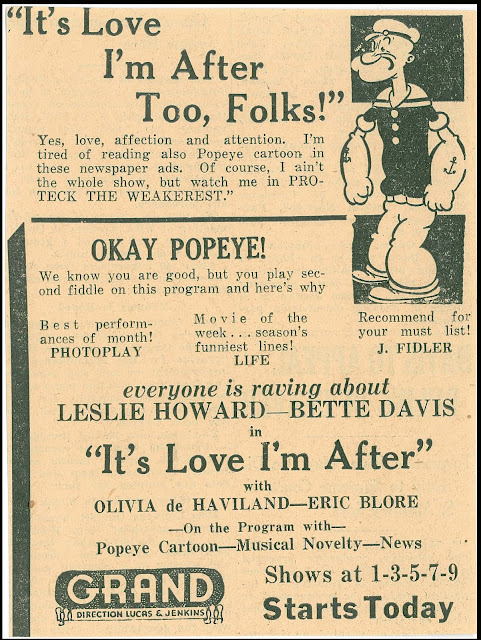 I've never been to Goat Island State Park, but Google searching reveals its location to be Niagara Falls, N.Y., plus fact that Goat Island is our country's oldest state park. Wish I'd been present for that thousand egg hunt sponsored by the Fox Cataract Theatre, that name denoting either large waterfalls or a medical condition of the eyes. Given the theatre's location, we can assume this Cataract did indeed refer to waterfalls. In fact, Niagara Falls has itself been called Cataract City. The Mickey Mouse Clubs were a nationwide craze that lasted through the thirties and beyond, boasting thousands of participating theatres. Special events were commonplace as showmen sought to involve club membership in activities well beyond boundary of their auditoriums. This Easter egg hunt was even recorded by Fox Movietone cameras, presumably for use in a newsreel. Is it any wonder Mickey Mouse was the Number One cartoon name? His seventh birthday is celebrated in a Loew's State (city unknown) ad wherein eight Mickey and Silly Symphony cartoons are featured, including the ubiquitous Three Little Pigs. I've found innumerable birthday party ads for MM, going right through the thirties and continuing well past television's arrival. Popeye ran close behind Mickey as King Of Cartoons. Here he is commanding top position in an ad for It's Love I'm After, a 1937 Warners feature with Leslie Howard, Bette Davis, and Olivia DeHavilland. This was at least one showman's tacit recognition that an animated extra could be strongest lure on the bill, for Popeye was peaking by that year with shorts like Protek The Weakerist achieving laff summits. The biggest 30's noise was from three Popeye specials extended to two-reel length and animated in Technicolor. They got deluxe placement in many ads I found, one shown here being typical. Fleischer's multi-plane miracles were touted by showmen promising "18 Minutes of 3-Dimensional Laughs." Popeye The Sailor Meets Sindbad The Sailor was opener for the color group, its ad designation as a "feature" being so persuasive as to cause many to remember it as such. Considering the fact Sindbad amazes still, just imagine the effect it had on 1936 audiences ...