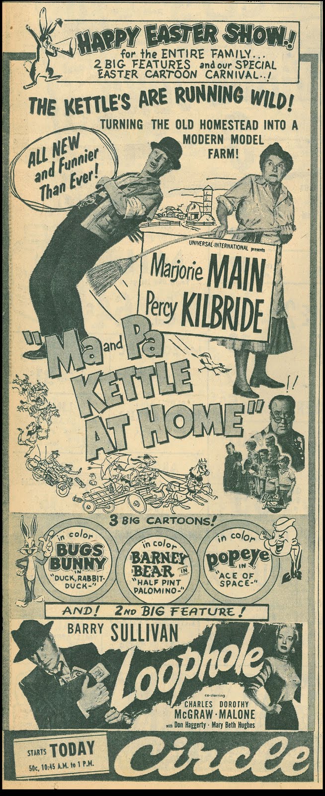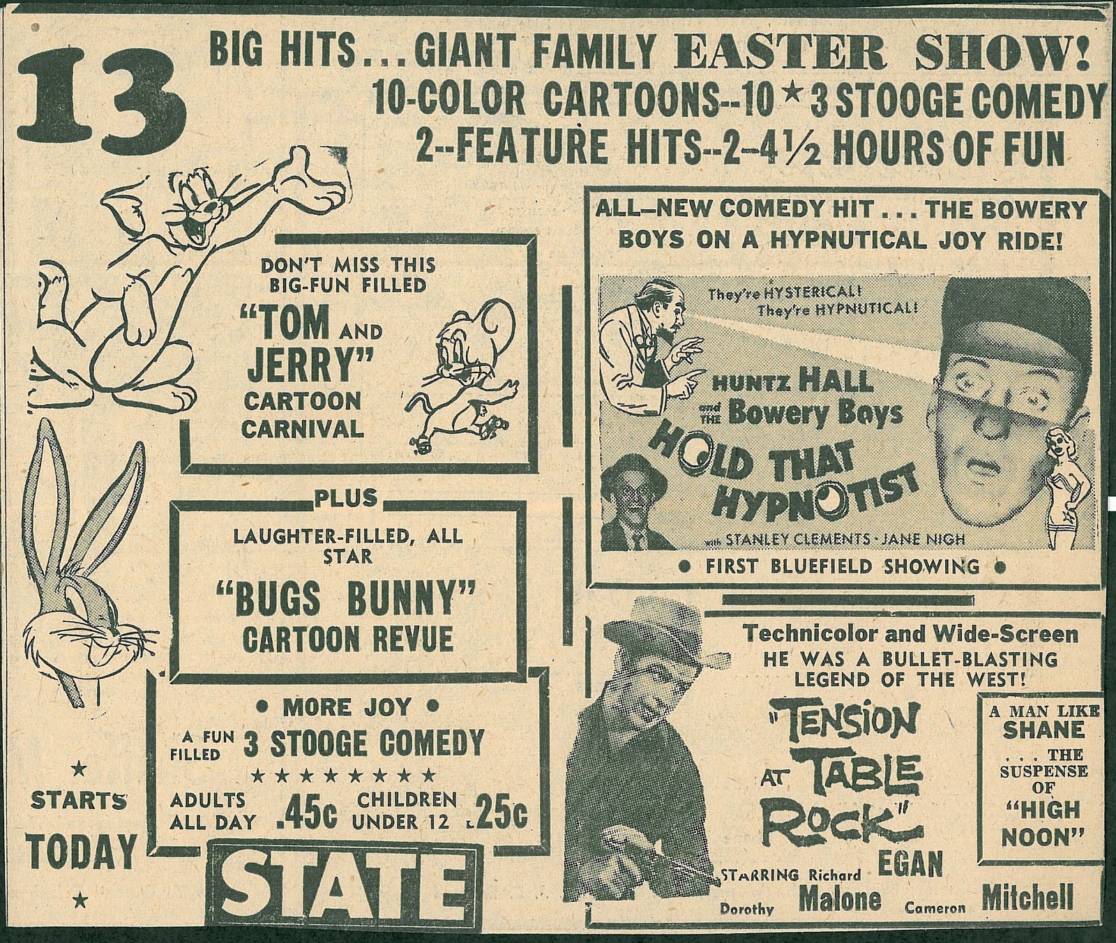 This time, I wanted to sample ads where theatres laid cartoons on thickest. Were so many animated shorts able to keep a young crowd's undivided attention? I'll bet shows like this one at Bluefield's State Theatre were thoroughgoing madhouses, what with a Tom and Jerry Carnival, Bugs Bunny's Revue, the Three Stooges, and a Bowery Boys leading into Tension at Table Rock. Tension indeed for house staff trying to keep order among patronage so over-stimulated. Are there places today the equivalent of these weekend matinees for letting off steam (other than public school systems)? Vegetating in front of DVD Bugs Bunny revues could not approach this. It just dawns on me that I've never seen Bugs or Tom and Jerry with a large audience, nor more than a handful of cartoons which appeal I presume to understand. What would that have been like? Laughter is contagious enough in a majority of adults. Theatre kids already hopped up on sugar bars and sodie pop must have all but wrenched chair bolts out of floors. More than one exhibitor has told me how vital it was to maintain order during these hyper-thons. Usher help needed, at the least, whips and chairs. Knowing what sweets do to one child, imagine hundreds chasing the same high of concessions plus cartoons. Could an emerging drug culture have been thwarted by simply giving youth continued access to shared euphoria like this? Too much joy of animation was lost when TV swallowed it whole. DVD providers can restore picture and sound, but not tribal rites of discovering cartoons in the company of excited peers.
