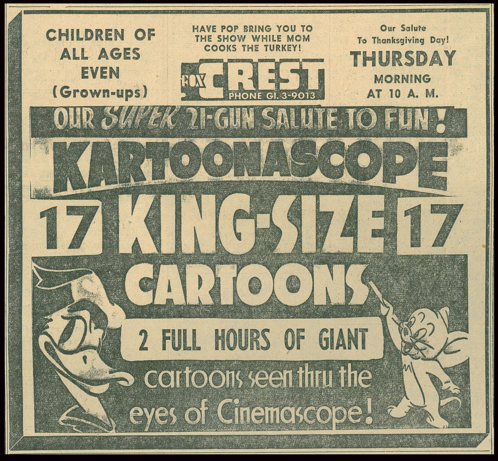 On another note: I wonder if that "Kartoonascope" ad could possibly be for the Crest here in Sacramento? It was a Fox West Coast Theatre throughout the '50s and '60s; there's no address, but the phone number (GLadstone 3-9013) is a Sacramento exchange. (The Crest is still going, a specialty house now; recently showed the restored Metropolis.)