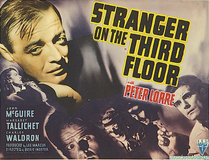 Stranger On The Third Floor was made for a paltry $171,000, but still lost money ($56,000). Variety thought it derivative, which made me wonder just what pics they felt Stranger leeched off of, as I can't think of anything before remotely like it. You could say RKO was scrounging German thrillers (a few critics thought so), or maybe it was Stranger's largely émigré crew taking inventory of dark Euro memories from their own pasts. Whatever the origin, Stranger comes off like probing engaged while supervisors weren't looking ... but why should they, with stakes and expectation so low? Peter Lorre was the putative star among an unremarkable cast. He was still as much known for perverse villainy as Mr. Moto sleuthing, even as his part was minimal with dialogue concentrated in final minutes. Suspense was inherent in Lorre's weird persona. His was a brand of sinister American thesps didn't even attempt, and certainly there was no duplicating that face and past tortures it suggested. A whole 40's trajectory for RKO was forecast with Stranger On The Third Floor, as though someone announced this would be house style for a coming ten years. Bill Everson said Stranger anticipated Val Lewton thrillers, and I'm wondering if Orson Welles peeked in while readying Kane. Certainly staff labored here that would go on to distinguish both Lewtons and RKO noirs, including camera genius Nicholas Musuraca, who did five for VL and Out Of The Past besides. Some have labeled Stranger On The Third Floor a horror film, not untoward if only for a nightmare sequence as chilling as any the studio devised, and come to think of it, I did see Stranger a first time on Channel 8's Shock Theatre. That was a weekend from which I returned to find college hall mates who'd also watched and were now improvising their own Lorre dialogue. I like to hurt women with knives, one murmured ... not a line from the film, but withal a fit for this player truly one-of-a-creepy-kind. Interesting how people with then-limited viewing choices saw a late movie and spent a following week in reflection over it. Do TCM broadcasts make such impression now?